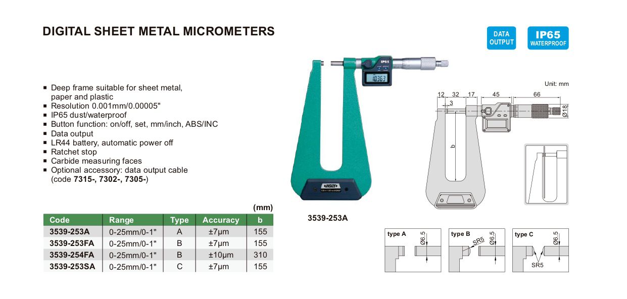 INSIZE 3539-254FA Digital Sheet Metal Micrometer (0-25mm/0-1") | EMINKH.COM