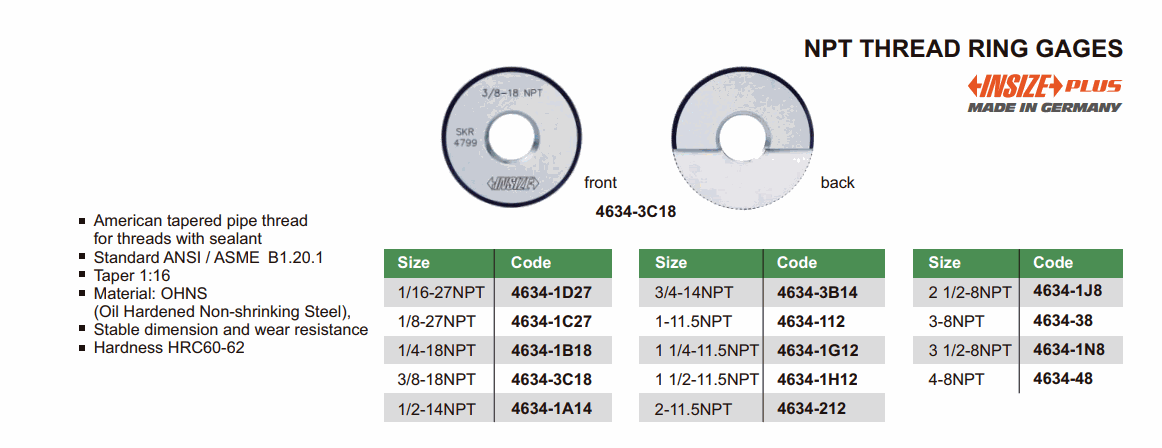 INSIZE 4634-3C18 NPT Thread Ring Gage (3/8-18NPT) | EMINKH.COM