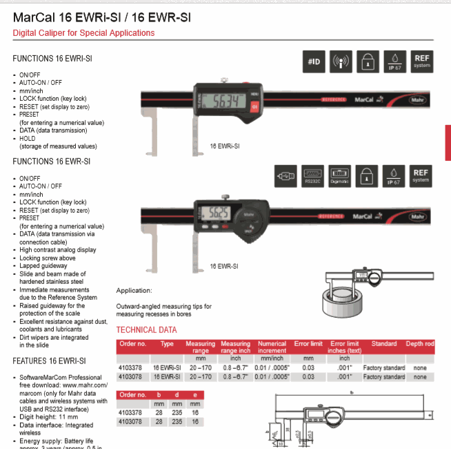 Mahr 4103078 Digital Caliper for Special Applications (16 EWR-SI, 20-170mm) | EMINKH.COM