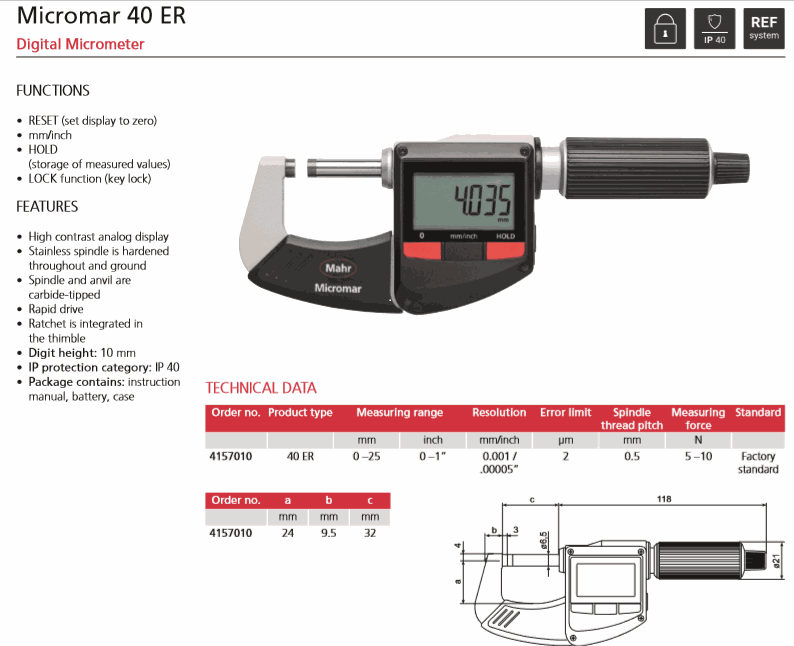 Mahr 4157010 Digital Micrometer (40 ER, 0-25mm/0-1") | EMINKH.COM