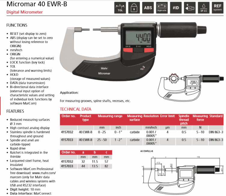 Mahr 4157032 Digital Micrometer (40 EWR-B, 0-25mm/0-1") | EMINKH.COM