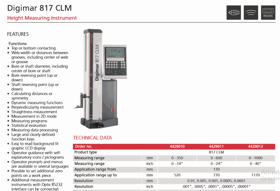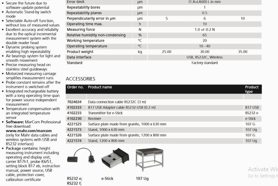 Package contains: height measuring instrument including operating and display unit, carrier 817h1, probe K6/51, setting block 817 eb, instruction manual, power source, USB cable, protection cover, calibration certificate