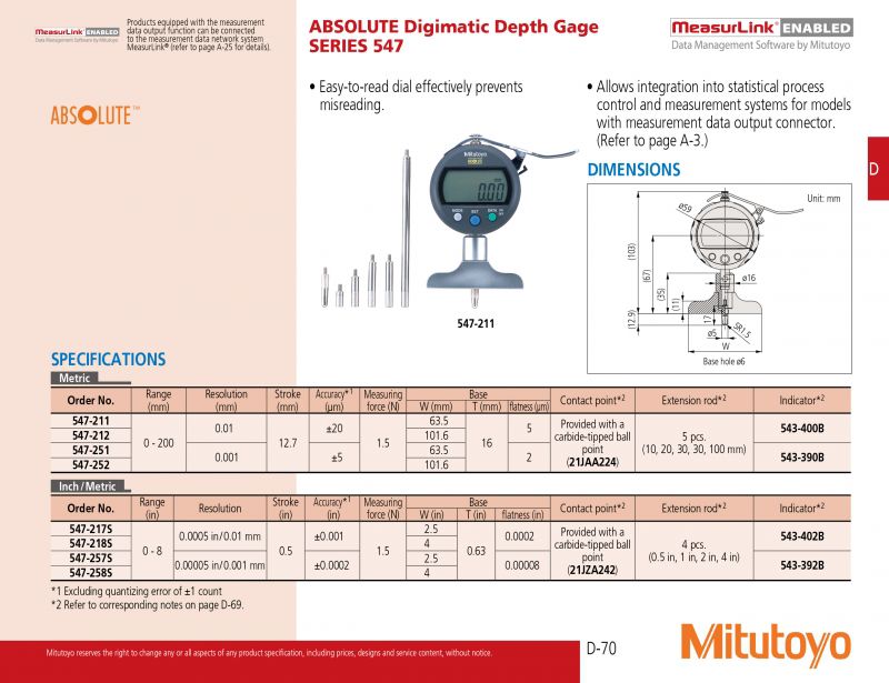 MITUTOYO 547-252 Digital Depth Gages (0-200mm/0.001mm) | EMINKH.COM