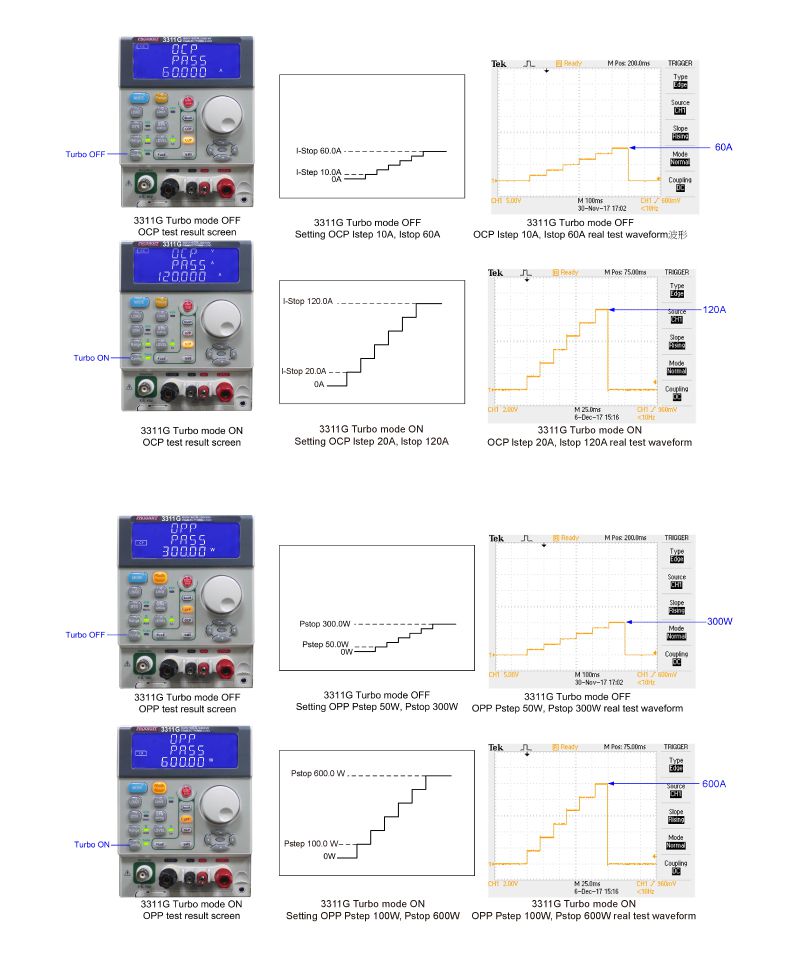 The power supply products under test must respond with the appropriate protection function but the abnormal situation duration is often quite short. To test for conditions, Prodigit's 3310G Series electronic load can increase the electronic load current and power in the new Turbo mode some period of time (within 2 seconds) up to 2 times the rated value. For example, the 3311G 60V /60A/ 300W in Turbo mode can increase its load current to 120A or power to 600W electronic load for up to two seconds. When verifying power products using Turbo mode in a production test environment, 3310G Series electronic loads offer greater test verification capability compared to conventional DC loads. Furthermore, the 3310G Series built-in measurement circuits can also measure the actual trip current value and protection response time under short-circuit or overload test conditions.