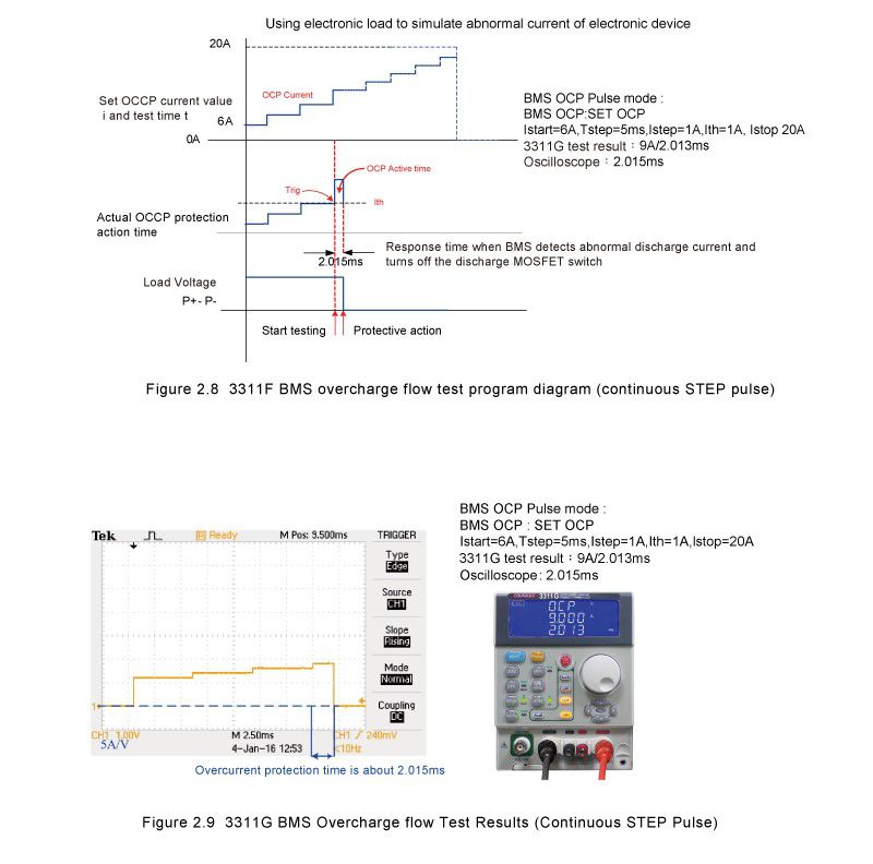 2.2.2 The overcurrent protection test mode of continuous STEP pulse is similar to the single pulse mode. In addition to the initial current setting, the continuous STEP pulse mode increases the time of each STEP, the current increased by each STEP and the current value of the final STEP. Figure 2.8 is the 3311G single pulse current BMS overcharge current test program diagram. Figure 2.9 is the actual test result, the left picture is the oscilloscope current waveform diagram when BMS overcharge current protection, the right picture is the actual test overcharge current value of 3311G BMS and Protect the reaction time.