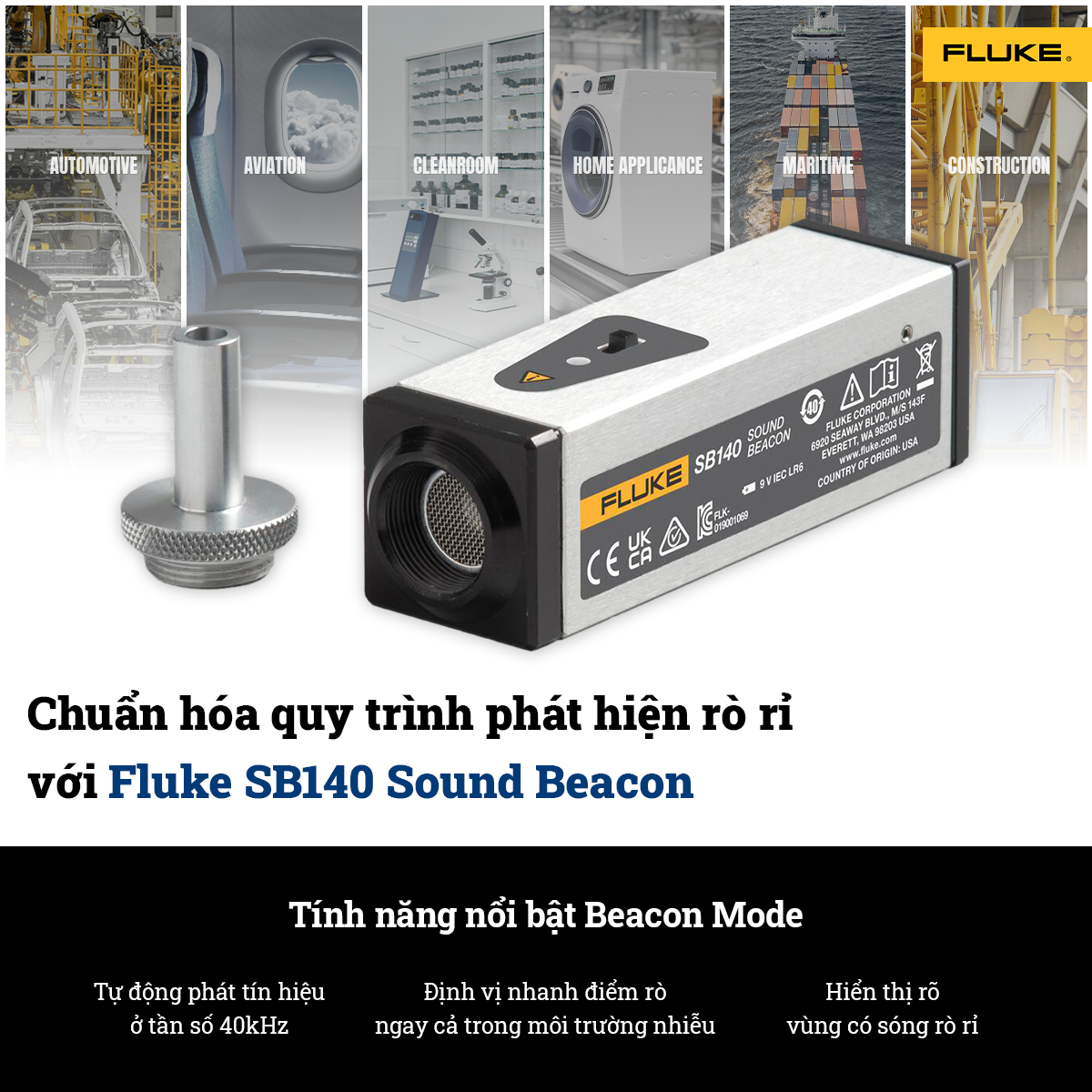 As quality control procedures become more advanced and non-invasive requirements become the norm in many industries, the Fluke SB140 Sound Beacon has proven to be an indispensable leak tester. Instead of relying on compressed air or liquid to create test pressure, the SB140's method allows for leak detection via high-frequency ultrasonic waves, ensuring safety, no internal pressure, and no disruption to the system structure.