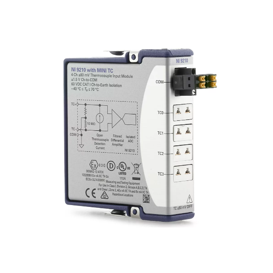 The C Series Temperature Input Module features up to 16 channels of temperature input from either thermocouples or RTDS. This module can include anti-aliasing filters, open-thermocouple detection, and cold-junction compensation. Additionally, the module also feature isolation for safety, noise immunity, and high common-mode voltage range.The C Series Temperature Input Module includes the NI-DAQmx driver and configuration utility that simplify configuration and measurements. NI-DAQmx supports NI programming environments as well as Python, ANSI C, C#.NET, and MathWorks MATLAB® software.