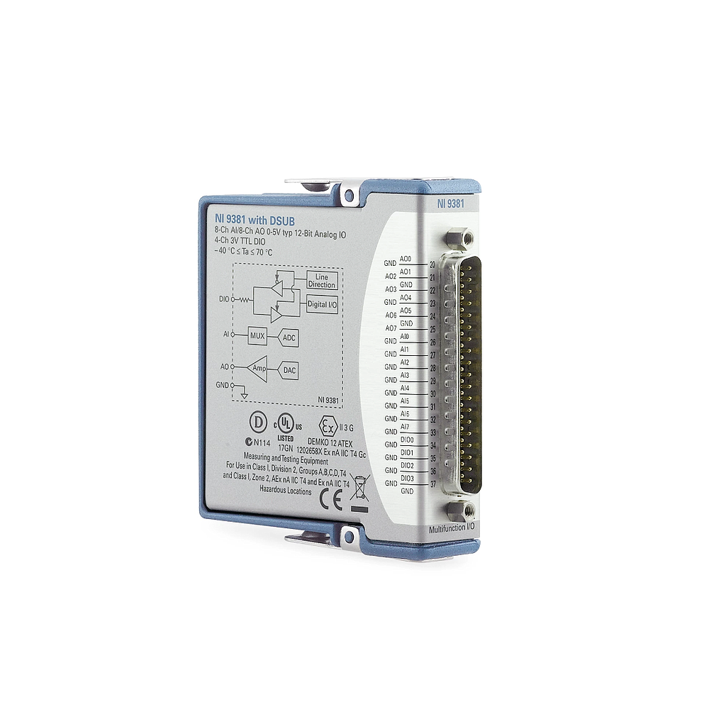 The C Series Multifunction I/O Module is a cost-effective, general-purpose I/O module that helps system designers fit more functionality into a single system. The module includes analog input, analog output, and 5 V TTL digital I/O channels.The C Series Multifunction I/O Module includes the NI-DAQmx driver and configuration utility that simplify configuration and measurements. NI-DAQmx supports NI programming environments as well as Python, ANSI C, C#.NET, and MathWorks MATLAB® software.