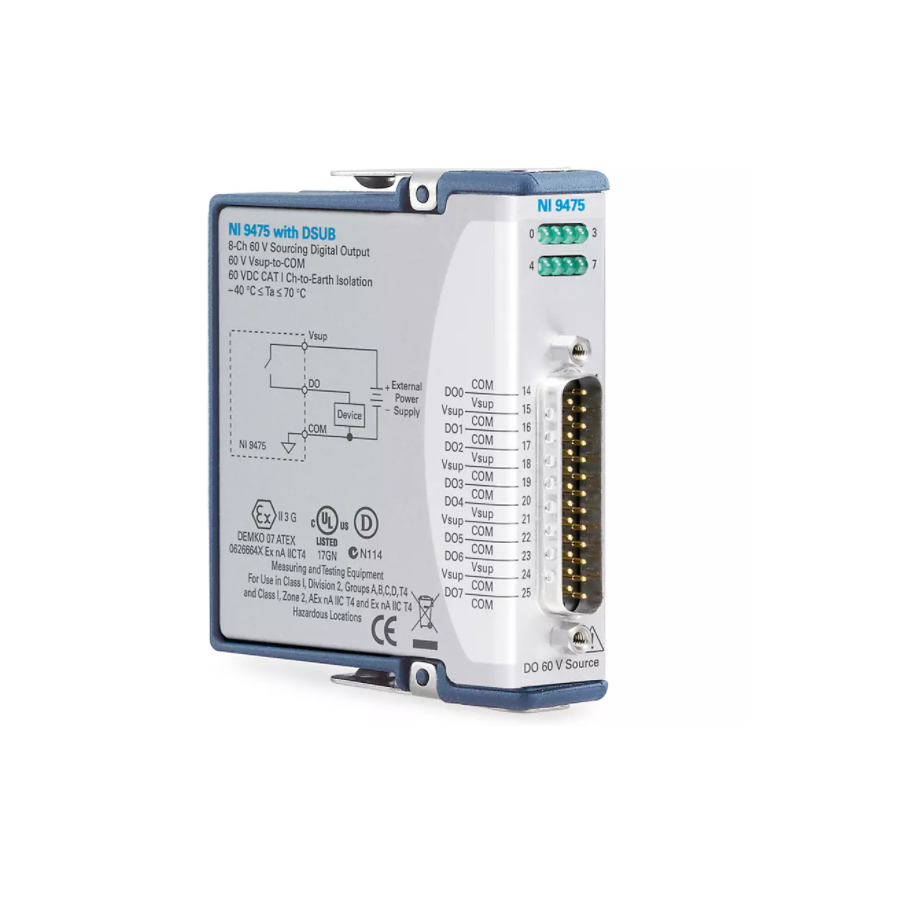 The C Series Digital Module interacts with a range of industrial switches, transducers, and devices. Some modules include an LED per channel that indicates the state of the channel. It supports input, output, or a combination of digital lines, and they can interact with a variety of voltages and logic levels, so they are well-suited for a variety of benchtop and industrial environments. Additionally, the C Series Digital Module also offers isolation options and sinking or sourcing capabilities to add further protection to your digital I/O application. When you use the C Series Digital Module with CompactRIO, you can use LabVIEW FPGA to create custom high-speed counter/timers, digital communication protocols, pulse generation, and more.The C Series Digital Module includes the NI-DAQmx driver and configuration utility that simplify configuration and measurements. NI-DAQmx supports NI programming environments as well as Python, ANSI C, C#.NET, and MathWorks MATLAB® software.