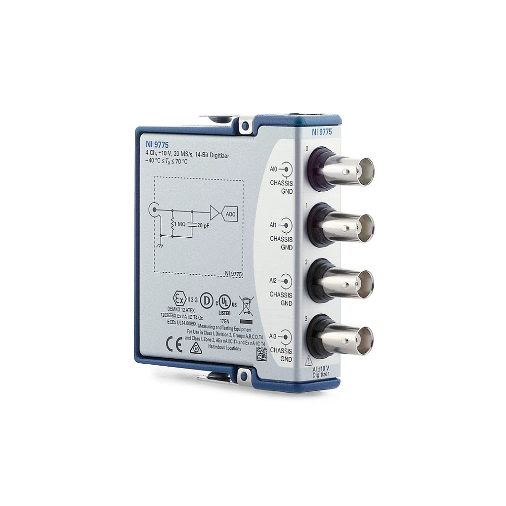 The C Series Digitizer Module takes both high-speed and high-resolution time- and frequency-domain measurements. It features up to four channels that can sample at speeds up to 20 MS/s—ideal for discrete detection of signals 10 MHz and smaller for applications such as fault detection, partial discharge analysis, and acoustic measurements. The module's store-and-forward architecture allows up to 128 Mbits of measurement data to be sent back to the CompactRIO Controller and analyzed. You can use the module as part of a CompactRIO system and use the LabVIEW FPGA Module to develop an advanced trigger based on low-speed streaming for added flexibility. This digitizer includes the NI-DAQmx driver and configuration utility that simplifies configuration and measurements. NI-DAQmx supports NI programming environments and Python, ANSI C, C#.NET, and MathWorks MATLAB® software.