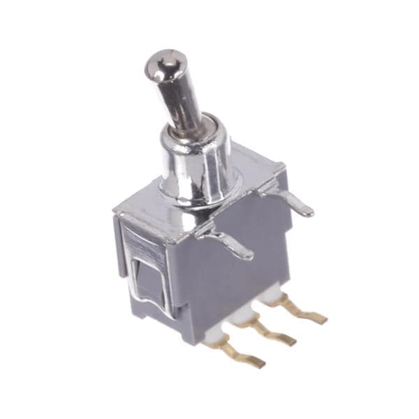 Nidec Components ATE1D-6M3-10-Z Subminiature Toggle Switch SPDT, ON-ON, 6mm toggle, 4mm smooth bushing, right angle PC terminals with .3" pitch, 50mA @ 60V AC/DC, washable