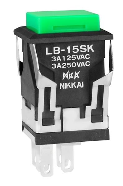 NKK Switches LB15SKW01-F Pushbutton Switches SPDT ON(ON) SQUARE BLACK BODY GREEN CAP | EMINKH.COM