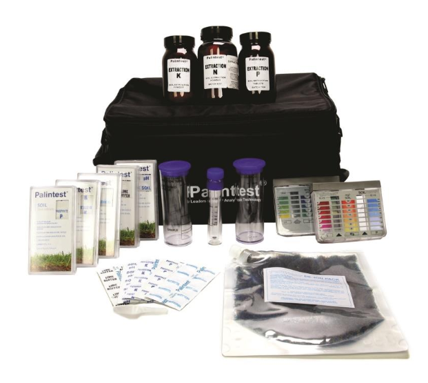 Complete soil test kit including reagents and hardware contained in a single shoulder case.