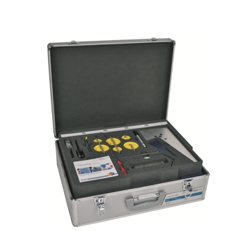 The equipment is stored in a robust aluminum case with removable lid