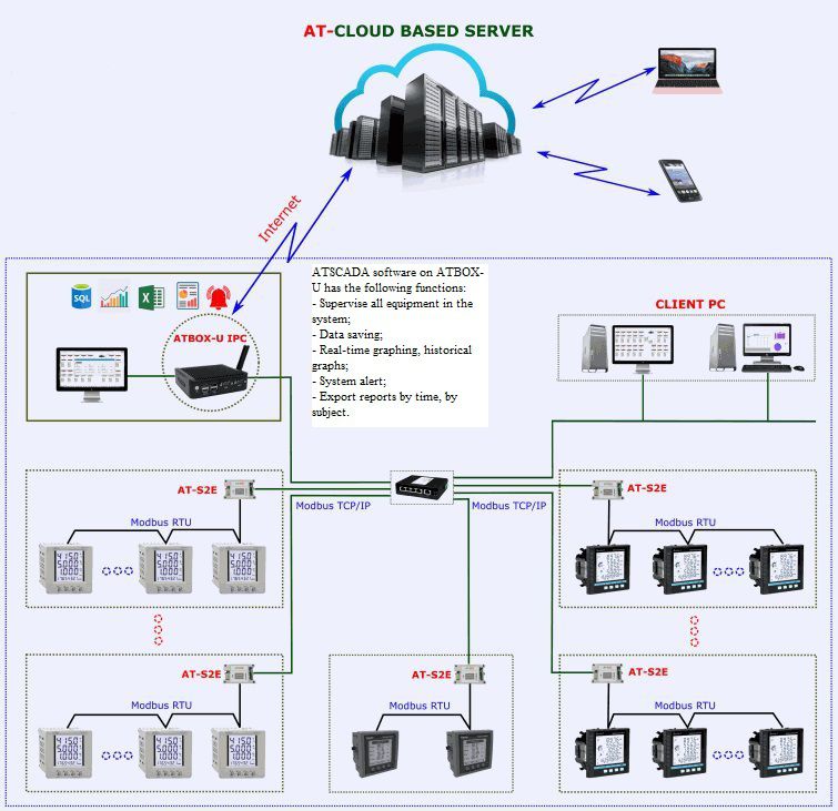 The power monitoring meters can be assembled into a rs485 modbus rtu network to transmit measurement parameters to an industrial computer running SCADA software. Here, implementing centralized monitoring, analyzing data to make warnings, graphically graphing parameters such as voltage, current, power consumption, ... for all quality monitoring equipment. electricity in the network. By default, the iPC computer does not support rs485 interface port. Therefore, an AT-S2E converter should be used to convert rs485 modbus rtu to modbus tcp / ip to SCADA software via ethernet port.