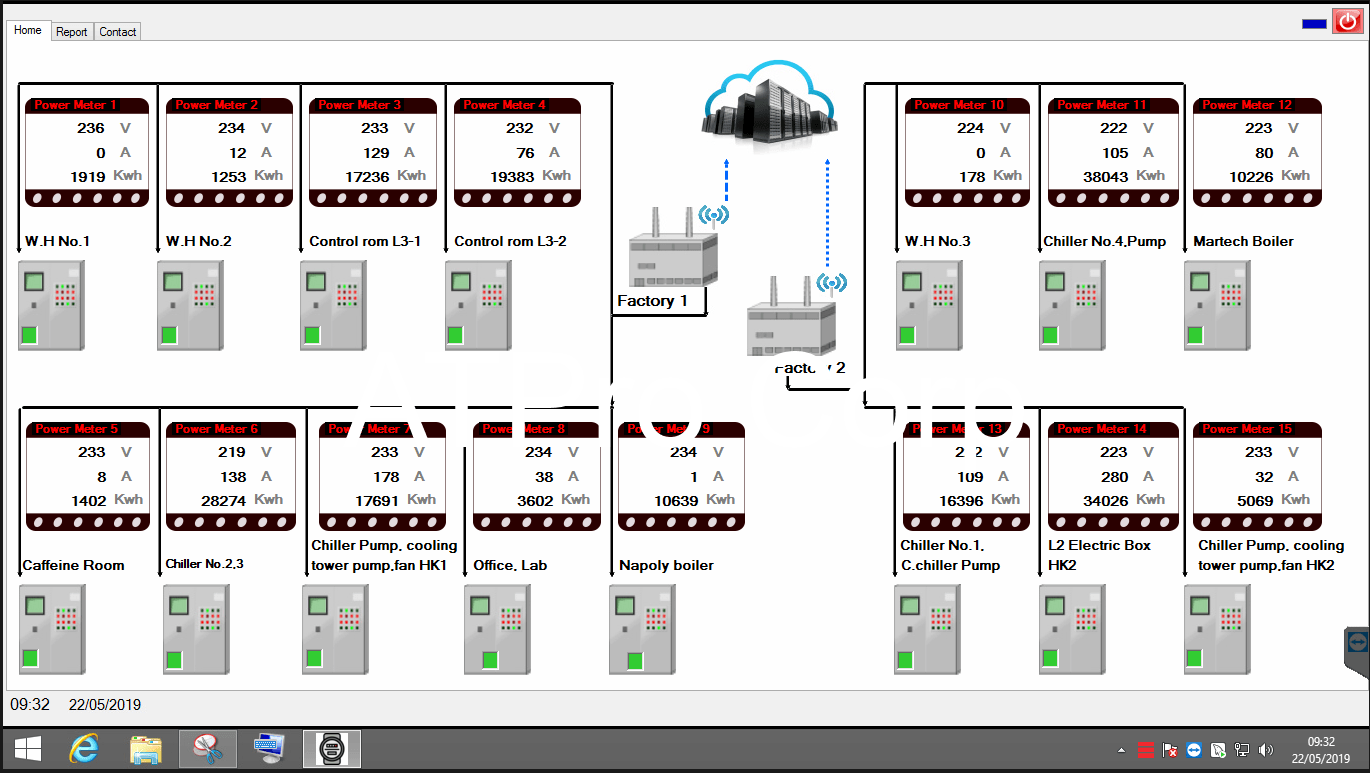 AT-PMS software centrally manages all power meters of the plant running on ATBOX industrial computer. This electricity monitoring software must have the quality of SCADA - Supervisory Control And Data Acquisition software. Translated into Control Software for monitoring and data acquisition. Inherited from Lab's ATSCADA software. So the AT-PMS power management software has innate features: