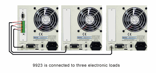 The 9923 can be applied to multiple parallel loads as needed. Because the 9923 current waveform generator uses the analog input function to control the load current, when the load power or load current is insufficient, you can obtain higher power and current using multiple loads. The 9923 supports parallelled operation of to up to three electronic loads. The 9923 rear panel provides 3 sets of Analog outputs (internal paralleled). In cases where more than three loads in parallel are needed, the user can use a T-type BNC connector to extended the output signal to more loads. The 9923 Current Waveform Generator Application Software scales corresponding waveform voltage level as the sum of the current of the parallel loads. For example, when 3 sets of 3311F 60V / 60A/ 300W are required to test 120A, each 3311F must allocate 40A current Analog input. This requires 6A / V, 40/6 = 6.66V. Thus, the 9923 application software voltage must be edited to 6.66V and then through the following diagram connected in parallel with three 3311F’s. Each 3311F will see an input voltage level equivalent to a 40A load current, resulting in a total of 120A.