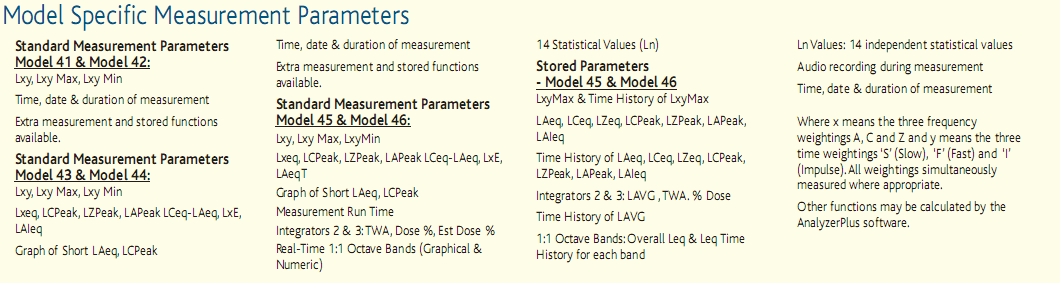 | Model 41 | Class 1 | SPL | A C Z (simultaneous measurement) frequency weighting F S & I (simultaneous measurement) Time weighting |