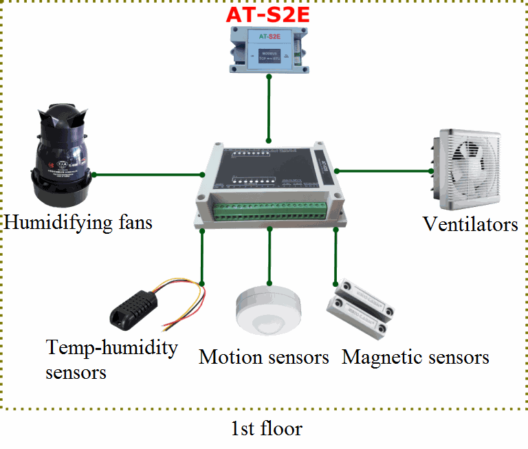 SMART IO AT-DIO8 connects to and receives data from end devices such as sensors and wifi modem in the system.