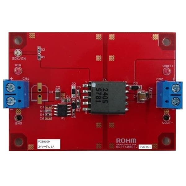 ROHM Semiconductor BD7F100EFJ-EVK-001 Voltage Regulator - Switching Regulator BD7F100EFJ-EVK-001 Evaluation Board deliveres an outputs 5 volts from an input 24 volts using BD7F100EFJ-LB, Isolated Flyback DC-DC converter integrated circuit, with output current rating of maximum 1A.