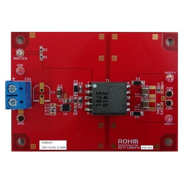 ROHM Semiconductor BD7F100HFN-EVK-003 Voltage Regulator - Switching Regulator BD7F100HFN-EVK-003 Evaluation Board deliveres outputs 15 volts and -15 volts from an input 24 volts using BD7F100HFN-LB, Isolated Flyback DC-DC converter integrated circuit, with output current rating of maximum 0.165A.