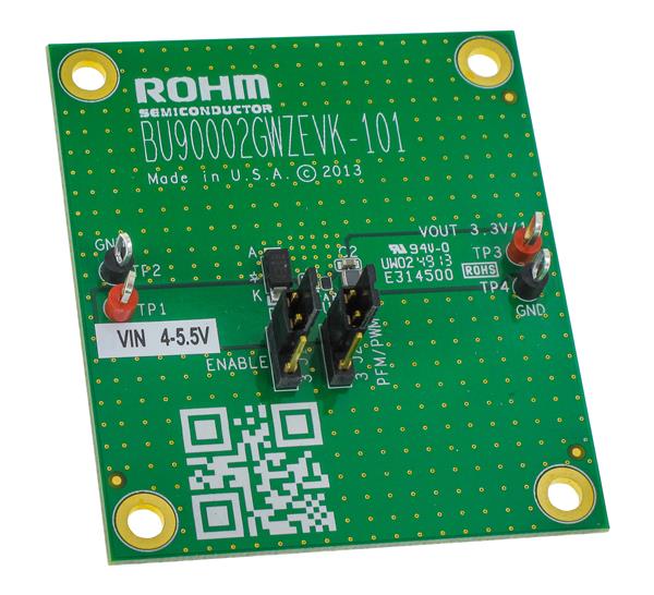 ROHM Semiconductor BU90002GWZ-E2-EVK-101 Voltage Regulator - Switching Regulator Eval Board for BU90002GWZ is a step-down regulator capable of proving a 3.3V,1A output from a 4.0V to 5.5V source.