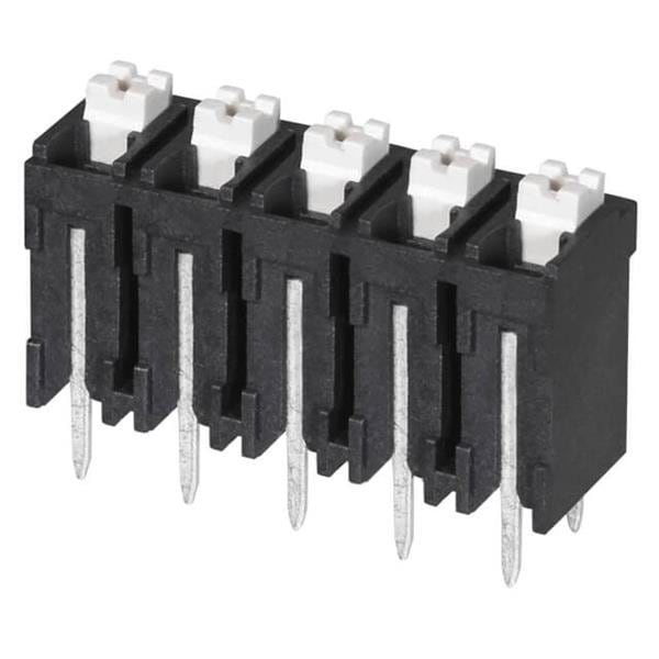 Same Sky (formerly CUI Devices) TBLH10V-500-05BK Fixed Terminal Blocks Terminal block, screwless, High Temp, 5.00, Vertical, 5, Black w Gray Button