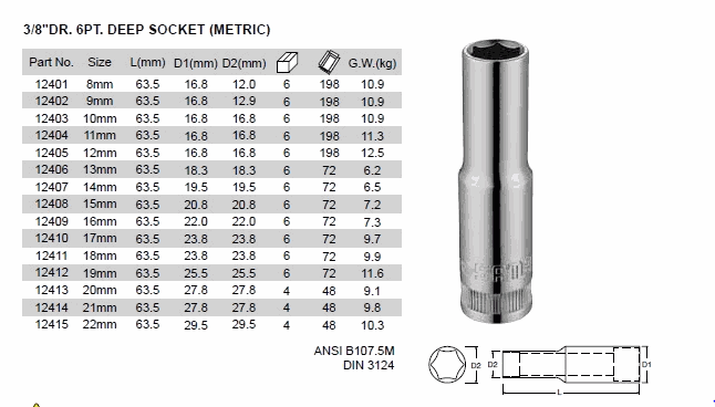 SATA 12408 DR. 6PT. DEEP SOCKET (3/8inch,15mm) | EMINKH.COM