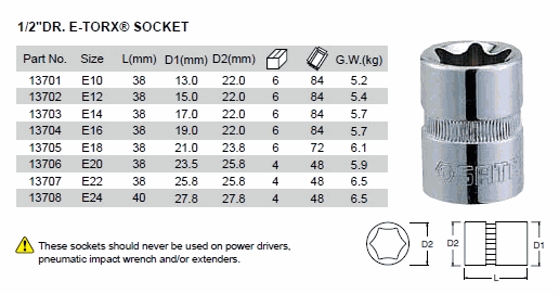 SATA 13708 1/2inch DR. E-TORX SOCKET (1/2inch) | EMINKH.COM