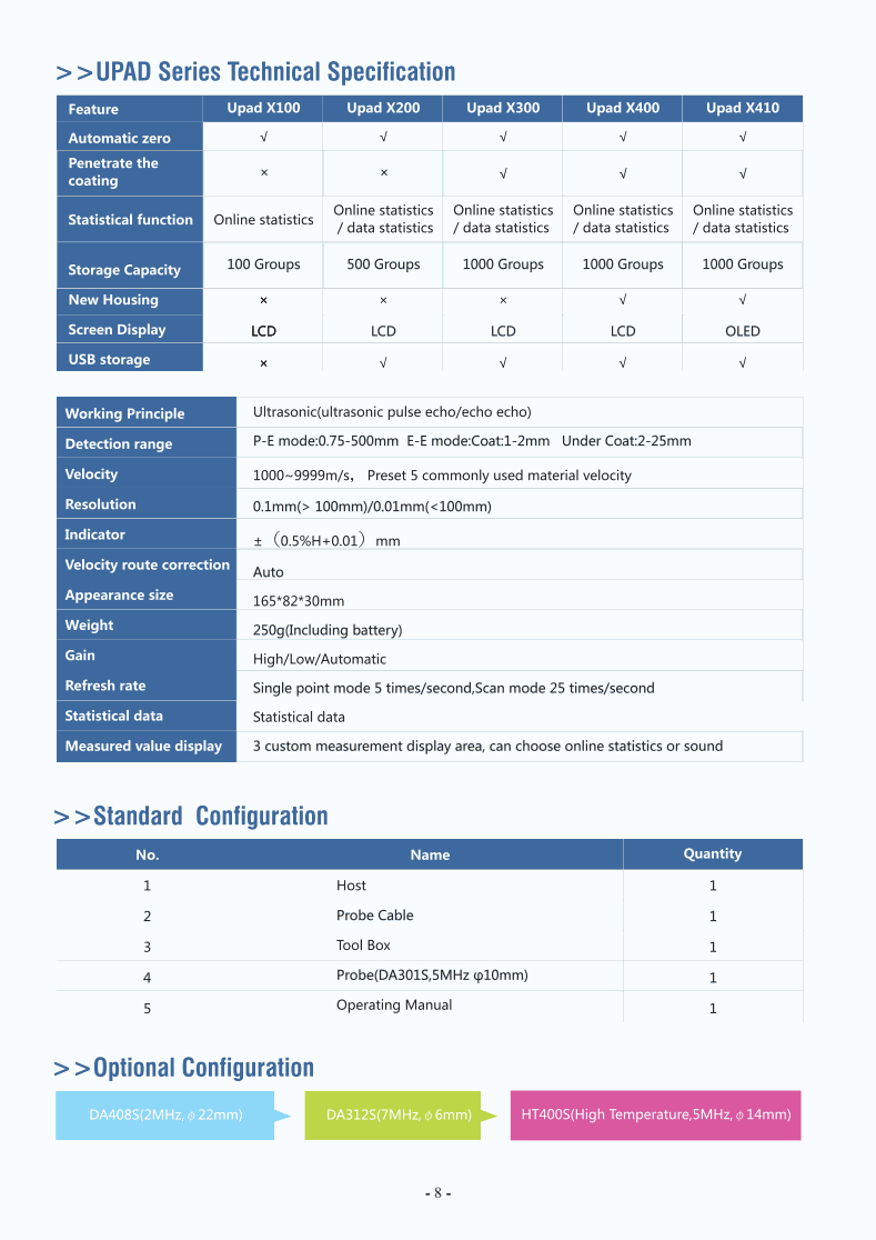 Optional: Probe DA408S(2MHz, Ø22mm), DA312S(7MHz, Ø6mm), HT100S(High Temperature, 5MHz, Ø14mm)