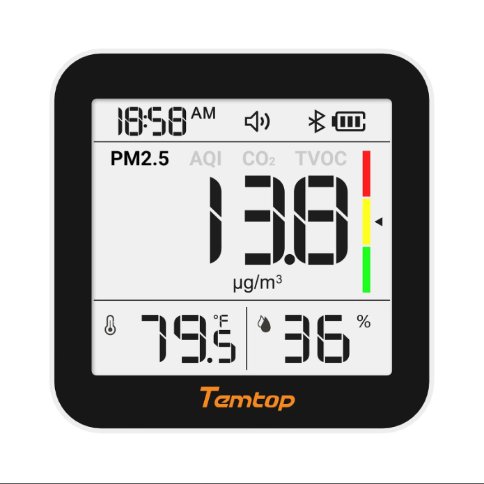 Functions: PM2.5, AQI, TVOC, CO2, Temperature, Humidity and Time with bluetooth