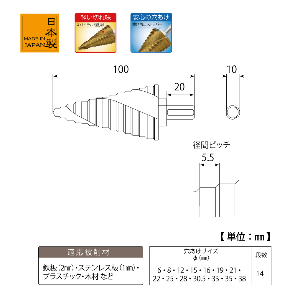 TOP Kogyo ESD-638SG Round shank spiral step drill (100mm) | EMINKH.COM