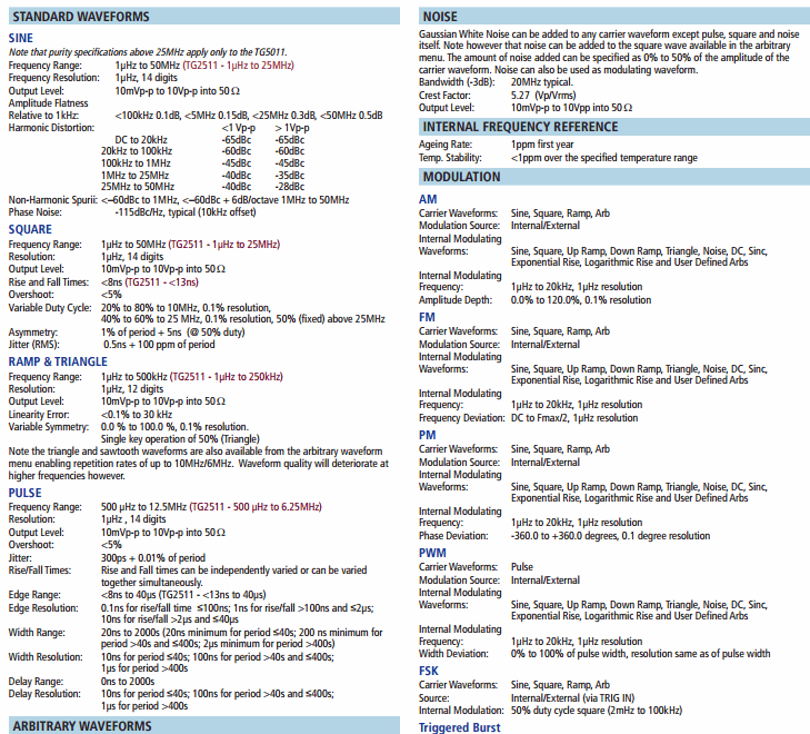 Frequency Range: 1µHz to 50MHz (TG2511 - 1µHz to 25MHz)