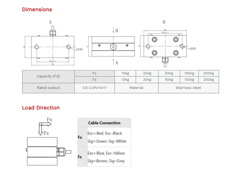XJCSENSOR X-2A-L80-W40-H37 2 Axis Load Cell (10kg~200kg) | EMINKH.COM